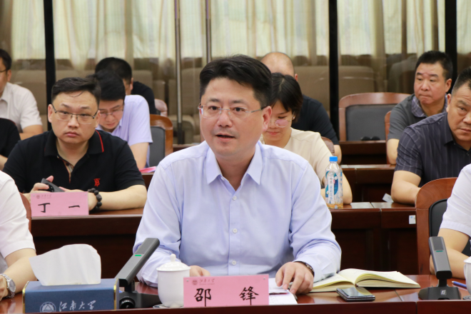 吴正国对邵锋一行的到来表示热烈欢迎,简要介绍了学校的历史沿革、办学格局、组织架构、科学研究、人才培养、社会服务等方面的发展现状。他强调,学校长期以来致力于科技创新和产教融合,如东作为长三角产业创新发展的热土,食品精深加工、生物医药、高端纺织等产业基础雄厚、前景广阔,与我校的优势学科高度契合。邵锋县长作为我校98级杰出校友,更能发挥好桥梁纽带作用,他希望校地双方可以开展形式多样的交流合作,拓宽成果转化渠道,为如东建设长三角北翼现代化强县注入“江南动能”。