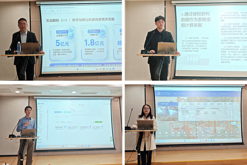 本次讲座特邀知识产权代理、法律实务、情报服务等领域资深专家,聚焦科研一线实际需求开展专题分享。中南伟业知识产权代理事务所合伙人唐灵围绕高校专利质量提升与转化运营进行深入讲解;京师(南京)律师事务所执业律师杨梦祥结合实务案例解读专利侵权诉讼取证要点;智慧芽高级客户经理储武扬分享AI赋能科研创新与情报获取的前沿应用;江南大学知识产权信息服务中心曹雪老师详细介绍了知识产权信息服务平台功能与服务内容。